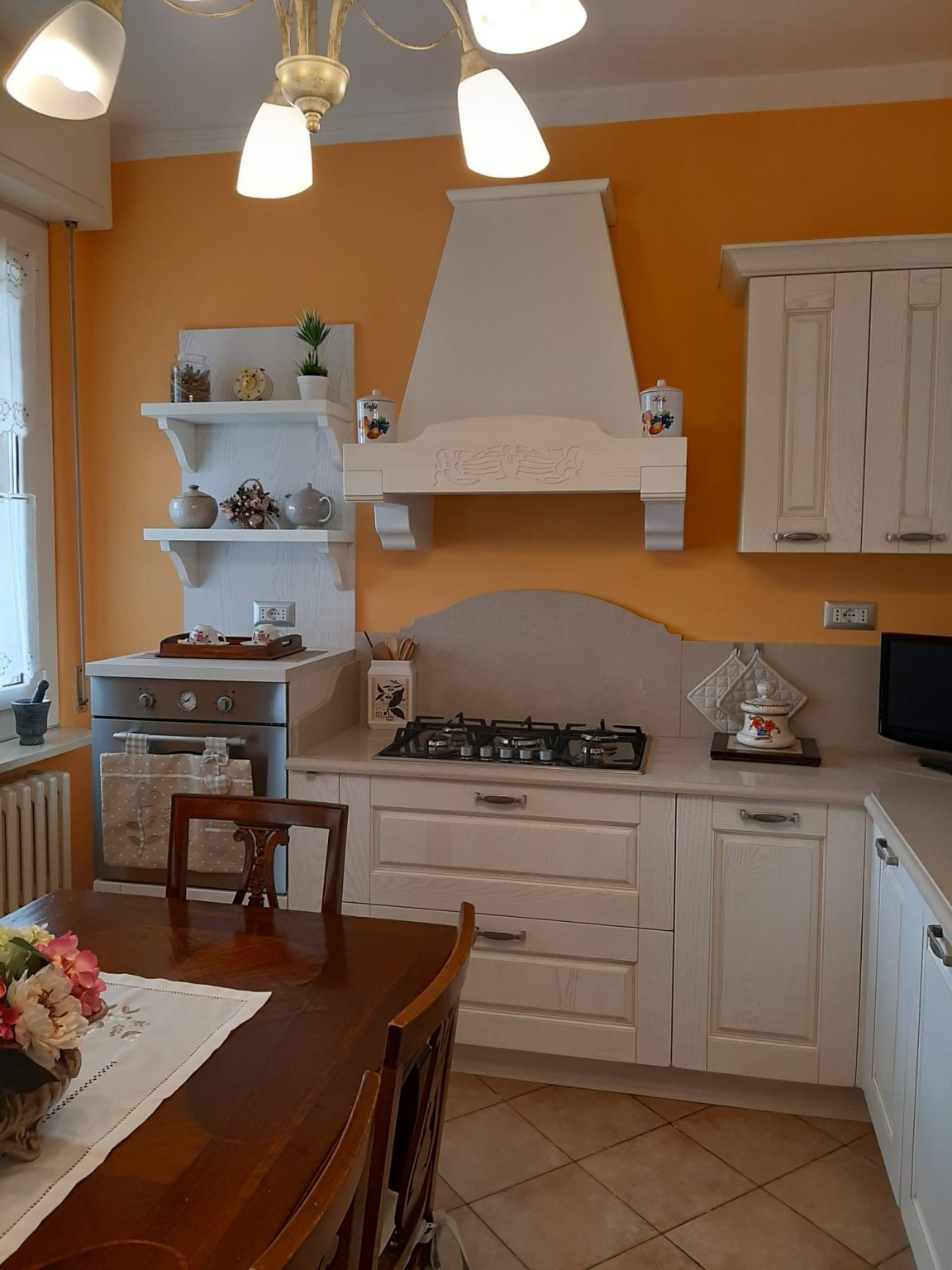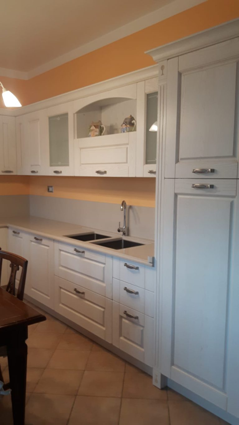 - Cucina stile provenzale che può essere realizzata in tutti i colori della scala RAL e su misura con dettagli richiesti dal cliente. Top e schienale in granito “rosso new rubin” per richiamare in questo caso la piastrella del pavimento.